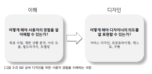사용자 경험을 이해하는 과정에는 목표 수립, 제반 상황 분석, 이슈 도출, 필드리서치, 모델링 등의 단계(Phase)가 있다. 뒷부분은 ‘사용자 경험 이해’를 바탕으로 디자이너의 의