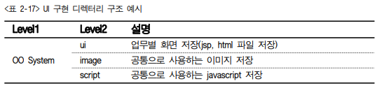 Level1에는 웹의 루트 디렉터리를 지정하며, Level2에는 프로그램 종류별로 저장되는 디 렉터리를 지정한다. UI 디렉터리 안에는 업무별 화면을, image 디렉터리 안에는 사이트에 사용되는 이미지를, script 디렉터리 안에는 자바스크립트를 저장한다